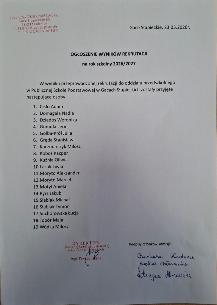 OGŁOSZENIE WYNIKÓW REKRUTACJI